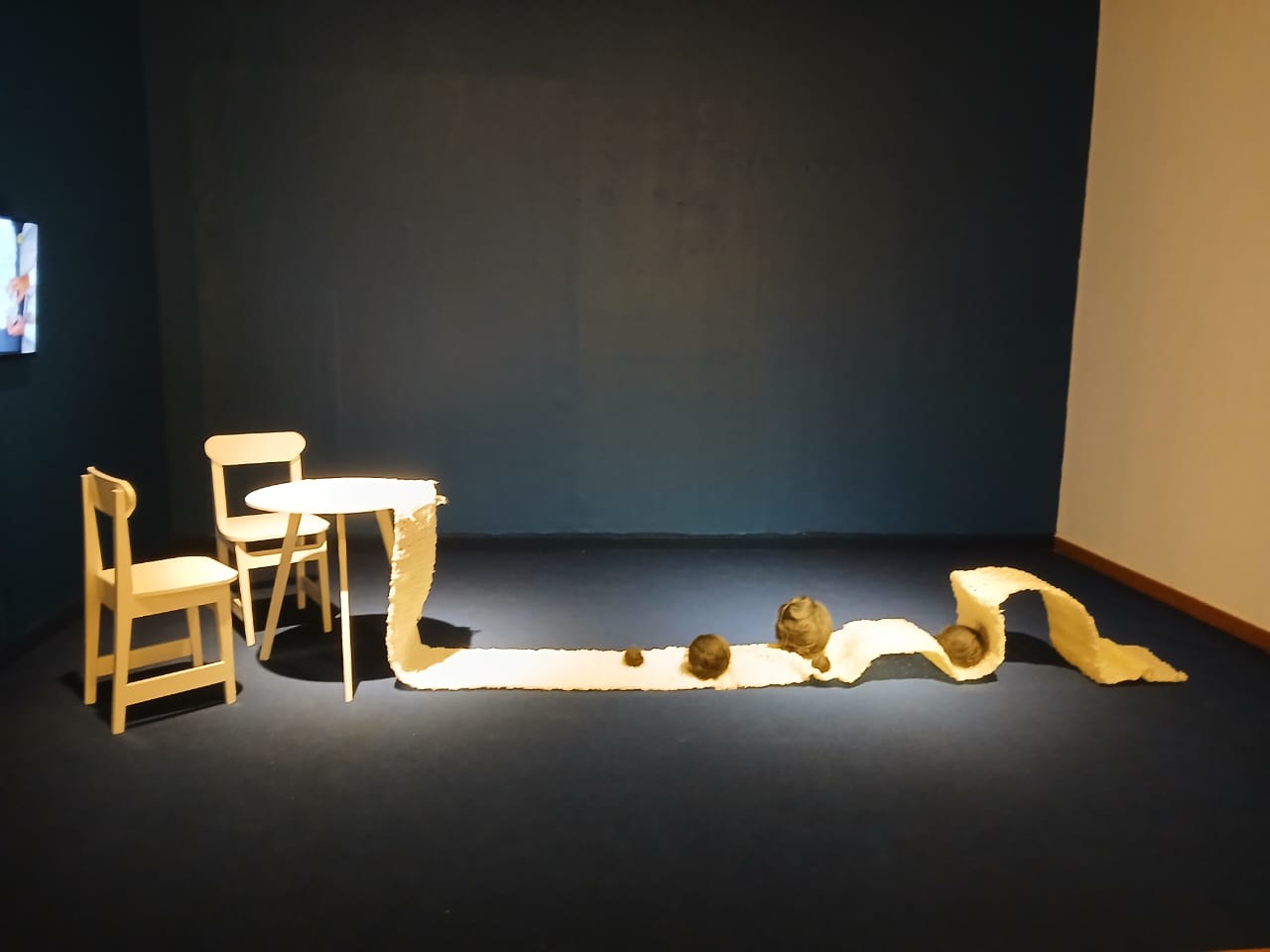 Media: Instalasi ruang dengan rambut sintetis, ragam pita, gerabah, kursi, dan meja