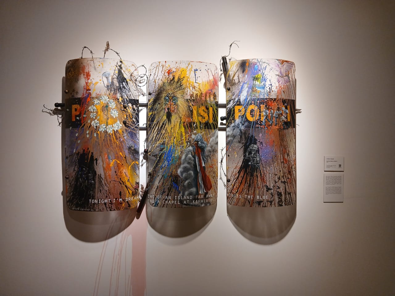 Media: Cat akrilik dan asam poli pada perisai anti huru-hara polisi